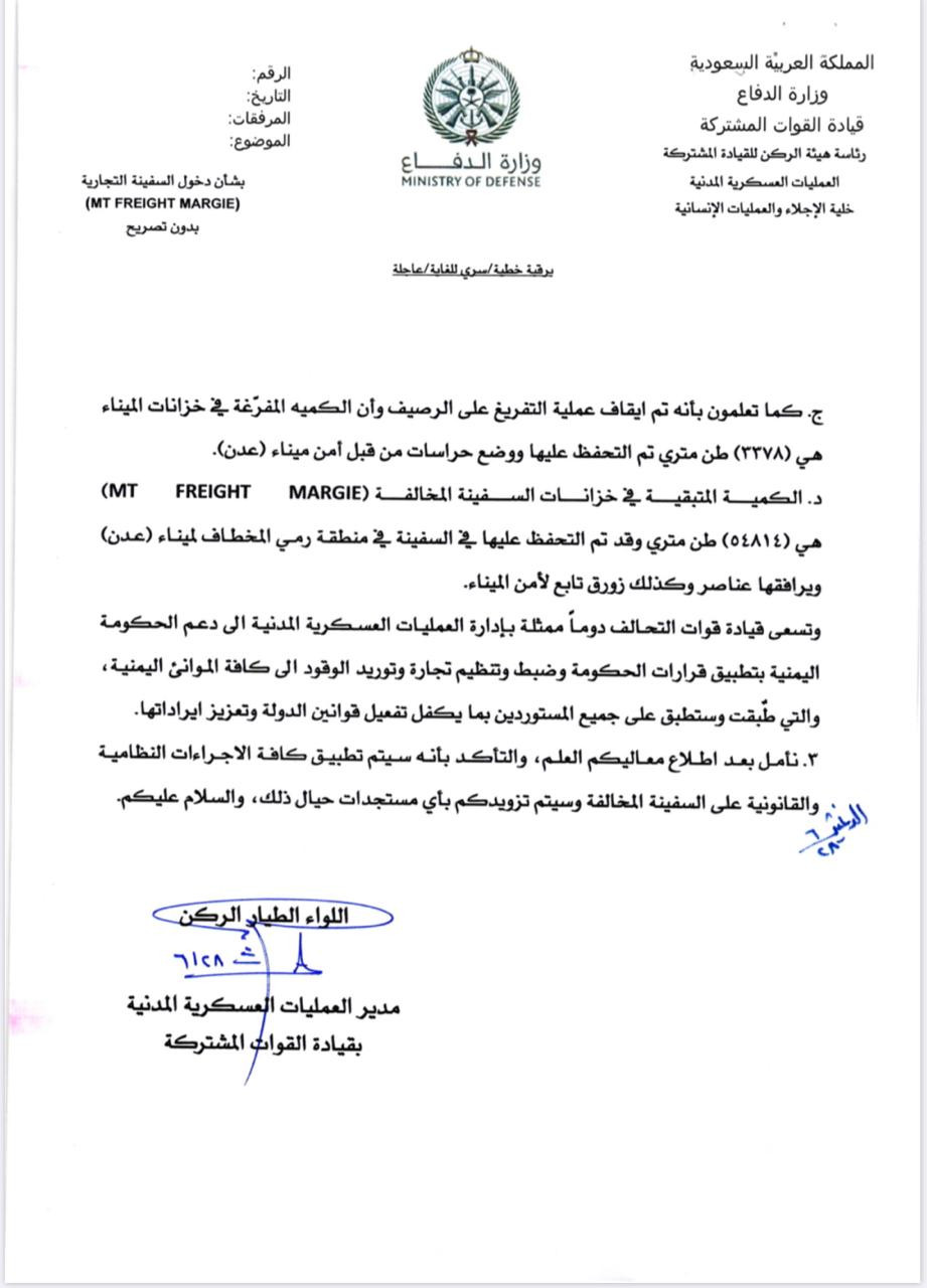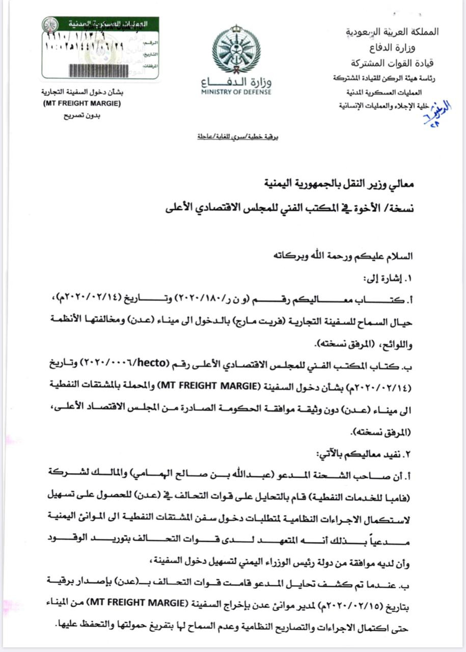 وحصل كريتر سكاي على صورة يظهر فيها ان عبدالله صالح الهمامي قام بالتحايل على قوات التحالف بعدن للحصول على تسهيلات لدخول الشحنة.
