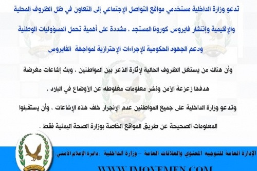 كما دعت إدارة التوجيه المعنوي بوزارة الداخلية على جميع المواطنين إلى عدم الانجرار خلف هذه الإشاعات ,وأن يستقبلوا المعلومات الصحيحة عن طريق المواقع الخاصة بوزارة الصحة اليمنية فقط.