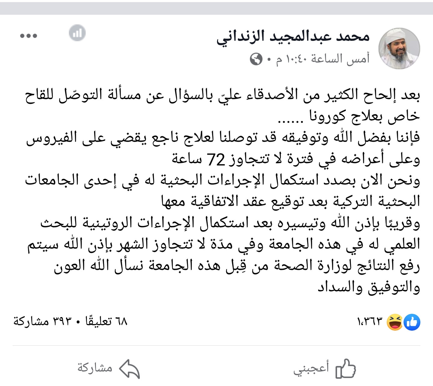 وقال محمد عبدالمجيد الزنداني:بعد إلحاح الكثير من الأصدقاء عليّ بالسؤال عن مسألة التوصّل للقاح خاص بعلاج كورونا .