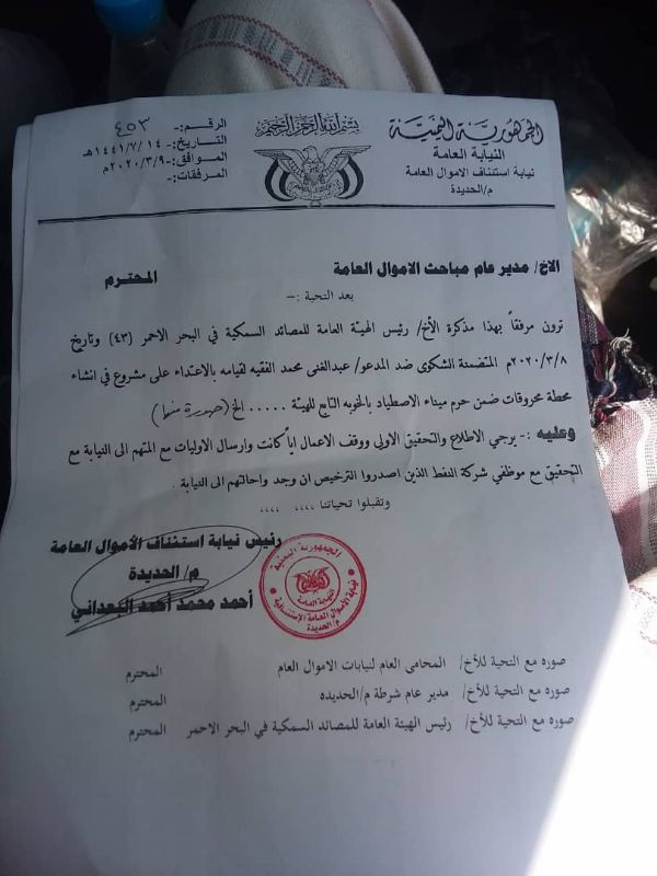 وفي مذكرة وجهتها شركة النفط اليمنية بفرع الحديدة الى مدير مديرية اللحية طالبتة بسرعة منع وايقاف بناء محطة بترولية بداخل مجمع مركز الخوبة والتي قام ببنائها المدعو/ عبدالغني محمد علي الفقية .. وجاء في المذكرة بأن المكان المصمم لإنشاء المحطة البترولية يقع على الساحل وهو يقع ضمن حرم الشاطئ مما يستوجب ايقاف ومنع بناء المحطة .. مذكرة اخرى من نيابة إستئناف الأموال العامة بمحافظة الحديدة موجهة الى مدير عام مباحث الاموال العامة يخاطبة فيها بوقف الاعمال التي يقوم بها المدعو عبدالغني الفقية وارسال الاوليات مع المتهم بالبناء والاعتداء على مشروع انشاء محطة محروقات ضمن حرم ميناء الاصطياد بالخوبة التابع للهيئة الى النيابة مع التحقيق مع موظفي شركة النفط الذين اصدروا الترخيص ان وجد وإحالتهم الى النيابة ..