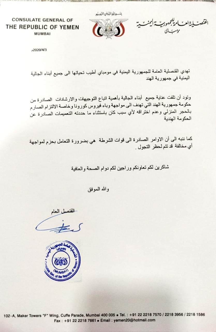 أصدرت القنصلية العامة للجمهورية اليمنية في مومباي تعميما هاما حول أهمية اتباع الارشادات الصادرة من حكومة الهند لمواجهة فيروس كورونا.