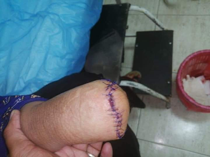 ويضيف بعد أن تم إزالة الفراشة تحولت قدمها الى اللون الاسود وبدأت بالتاكل وعند مراجعة الدكتور الخاص بالطفلة قال لهم مو نعمل لكم. مردفا ثم بدأ والد الطفلة مرحلة جديدة مع الغرغرينا ومراهم وعلاجات إلى أن تم اليوم بتر قدم الطفلة في المستشفى السعودي الألماني في صنعاء.