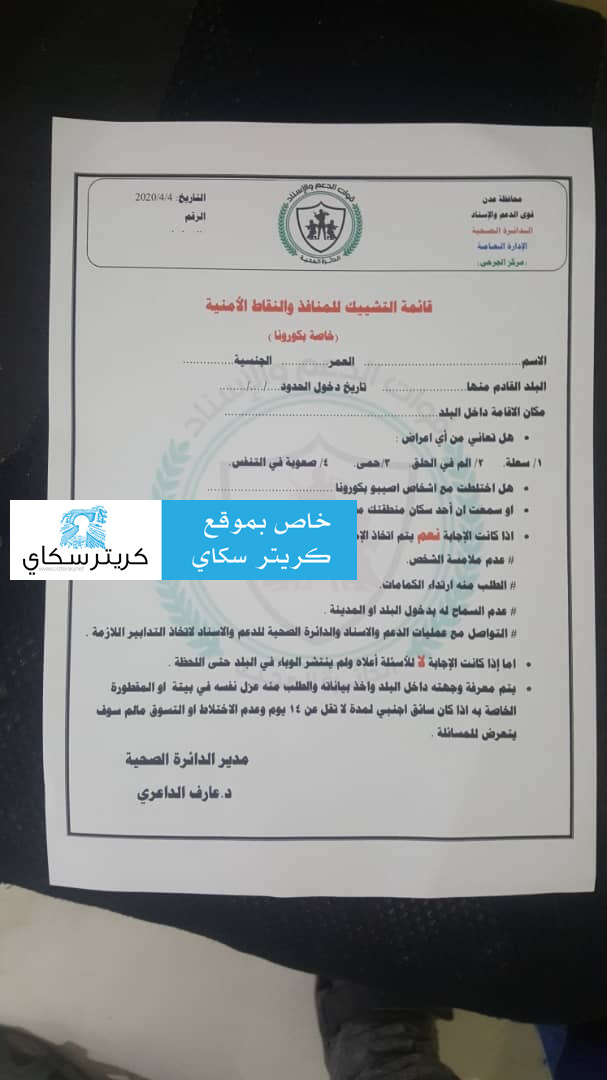 وتحصل كريتر سكاي على وثيقة أصدرتها الدائرة الصحية بعدن سيتم تنفيذها للتشييك لجميع النقاط الأمنية بمداخل ومخارج عدن لمواجهة فيروس كورونا.