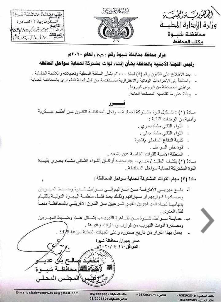 أصدر محافظ شبوه محمد صالح صالح بن عديوه قراراً يقضي بتشكيل قوات عسكرية مشتركة لحماية سواحل المحافظة ظاهرة التهريب وخاصة تلك المتعلقة بإنزال الأفارقة في سواحل المحافظة وذلك بعد فشل منظمة الهجرة العالمية بالقيام بمهامها تجاه المهاجرين الغير شرعيين في المحافظة .