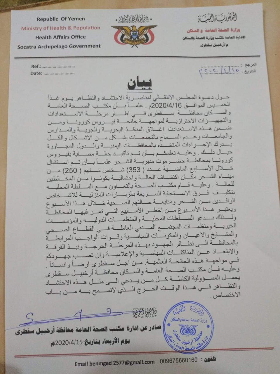 حمل مكتب الصحة العامة والسكان في محافظة أرخبيل سقطرى المسؤولية الكاملة لمن يدعوا للاحتشاد جماهيريا.