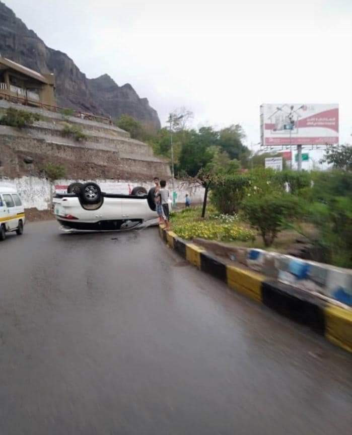 وقال مواطنون لكريتر سكاي: ان سيارة انقلبت أثناء انعطافها بسبب السرعة المصاحبة لهطول الأمطار والتي أدت إلى انزلاقها في المعلا.