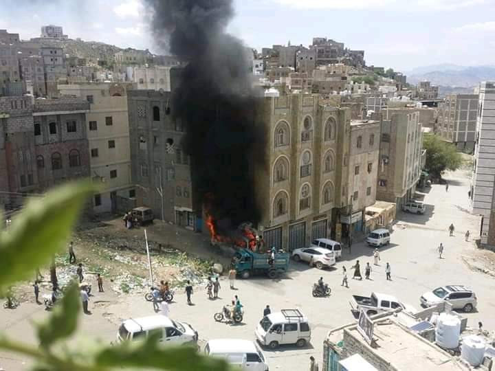 نشب حريق هائل قبل قليل بباص مواطن في مدينة تعز بشكل مفاجئ.