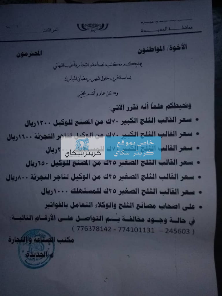 وحصل كريتر سكاي على نسخة منها يظهر فيها قائمة لاسعار الثلج بعد مناشدات للاهالي.