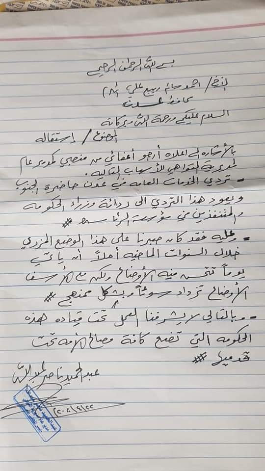 وأوضح الشعيبي، في نص الاستقالة بأن قرار استقالته يأتي بسبب تردي الخدمات في العاصمة عدن حاضرة الجنوب، والناتج عن ردائة وزراء الحكومة والمتنفذين في مؤسسة الرئاسة.