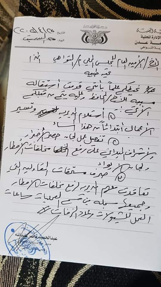 قدم مدير عام مديرية التواهي عبد الحميد ناصر الشعيبي، استقالته من منصبه إلى محافظ محافظة عدن احمد سالمين، ويكلف أمين عام السلطة المحلية في المديرية بتسيير الأعمال.