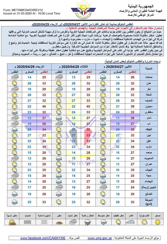 وفيما يلي بيان بدرجات الحرارة المتوقعة في المحافظات اليمنية: