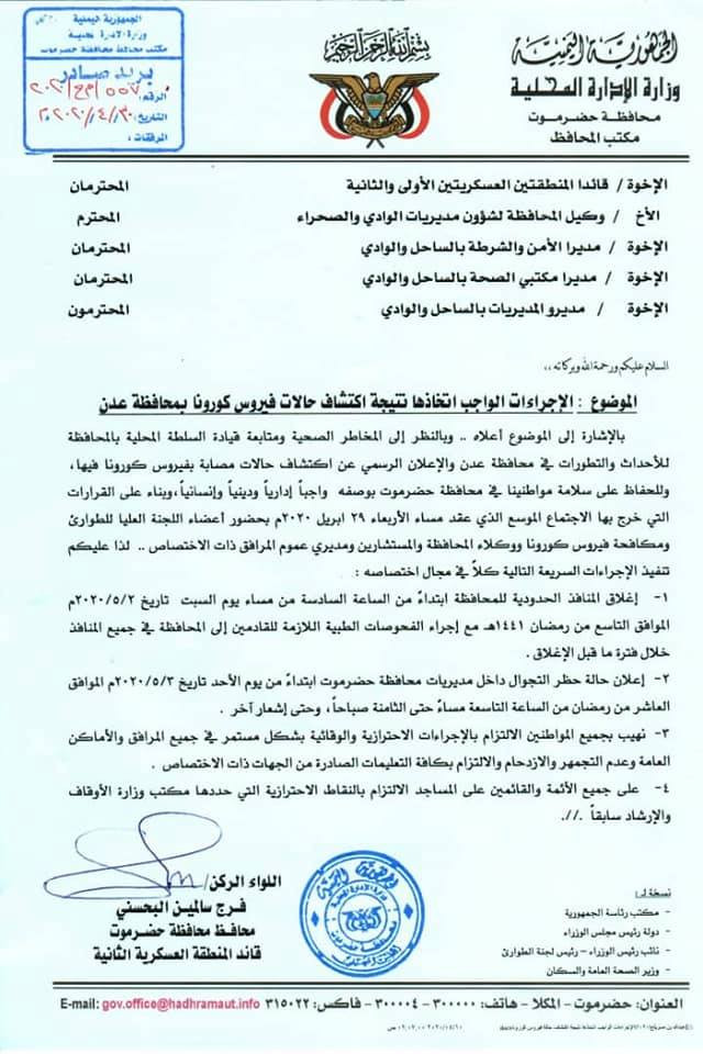 أقرت السلطات المحلية في #حضرموت إغلاق المنافذ الحدودية للمحافظة ابتداء من مساء اليوم.