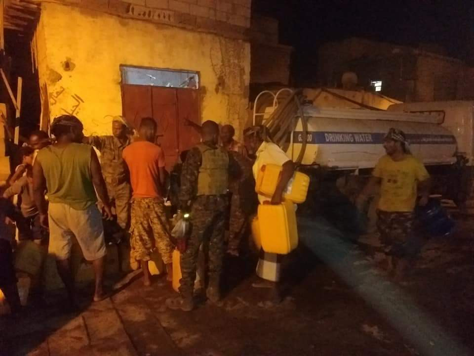 اغاثث قيادة الحزام الأمني بعدن أهالي حي المسبح بمياه الشرب.