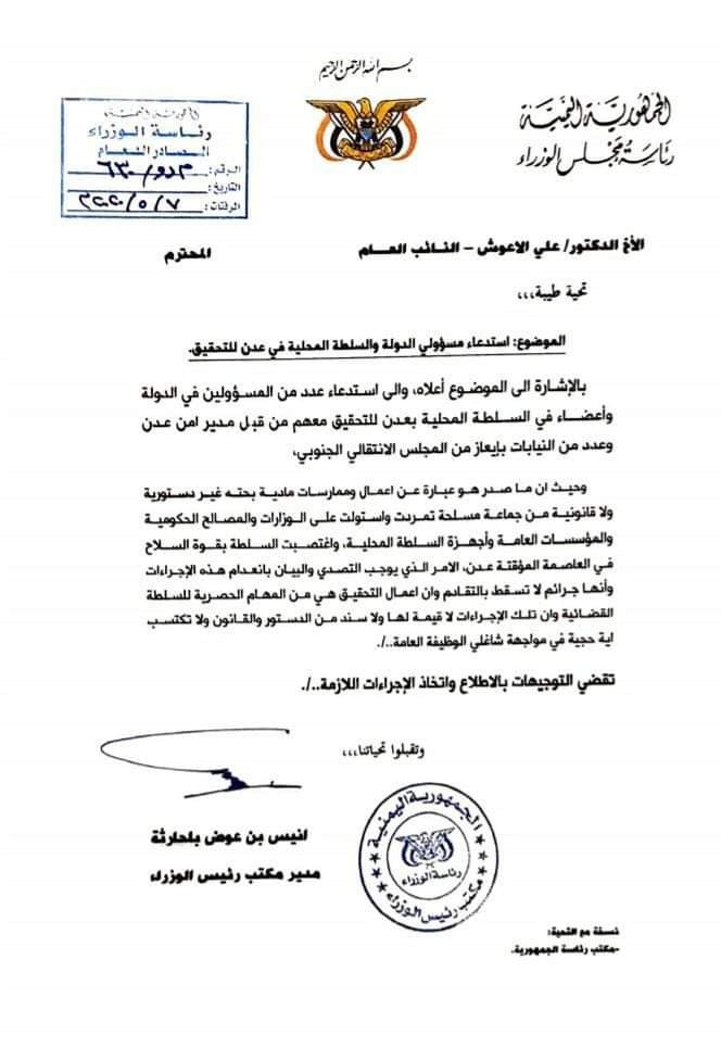 أصدرت الحكومة الشرعية تعميما هاما إلى النائب العام بشأن استدعاء مسؤولي الدولة بعدن للتحقيق معهم.