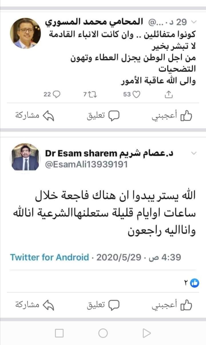 أثارت تغريدتان احدهما لعضو مجلس الشورى الدكتور عصام الشريم والاخرى لمحامي الرئيس الراحل على عبدالله صالح "محمد المسوري" تتحدث عن فاجعة قد تصيب الشرعية وسيتم الإعلان عنها خلال الساعات أو الأيام القادم.