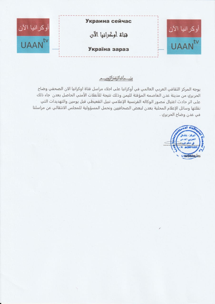 وجه المركز الثقافي العربي العالمي في اوكرانيا على اجلاء مراسل قناة اوكرانيا الصحفي وضاح الحريري من مدينة عدن.