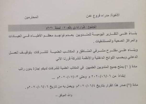أصدرت شركة أدوية بعدن قرار يقضي يمنح إجازة بدون راتب لجميع مندوبي الأدوية.