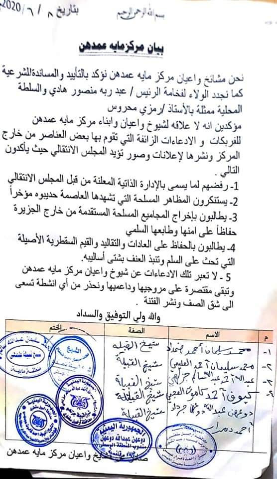 مؤكدين انه لا علاقة لمشائخ واعيان وابناء مركز مايه عمدهن للفبركات والإدعاءات الزائفة التي تقوم بها بعض العناصر من خارج المركز ونشرها لإعلانات وصور تؤيد المجلس الانتقالي حيت نؤكد التالي: