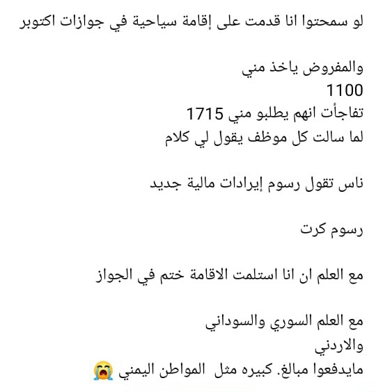 شكا مقيمون يمنيون في مصر رفع رسوم الاقامة من قبل الحكومة المصرية من ٧٠ دولار الى ١١٠ دولار.