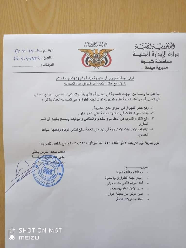 برئاسة الأخ محمد سعيد الخرس بافقير مدير عام مديرية ميفعة وفي اجتماعها المنعقد صباح هذا اليوم الاربعاء أقرت لجنة الطوارئ في مديرية ميفعة رفع حظرالتجول في اسواق مدن المديريه مع الابقاءعلى اسواق القات في مواقعها الحاليه حتى اشعار اخر ومنع الاكل والشرب في المطاعم والمنادي والبوفيات والمقاهي والسماح بالبيع في قسم السفري مع ضرورة التزام الجميع بالاجراءات الاحترازية لمنع تفشي وباء كورونا واهمها التباعد الجسدي في الأسواق والمناسبات العامه.