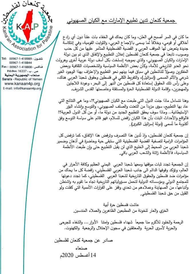 إن جمعية كنعان لفلسطين، وإذ تُدين هذا التصرف وترفض هذا الإتفاق، كما ترفض كل المؤامرات الرامية لتصفية القضية الفلسطينية التي ستبقى حية وحاضرة في أذهان وضمير شعبنا العربي من المحيط إلى الخليج الذي لن يقبل التطبيع حتى وإن طبعت الأنظمة السياسية، فالأنظمة زائلة والشعب العربي باقي.