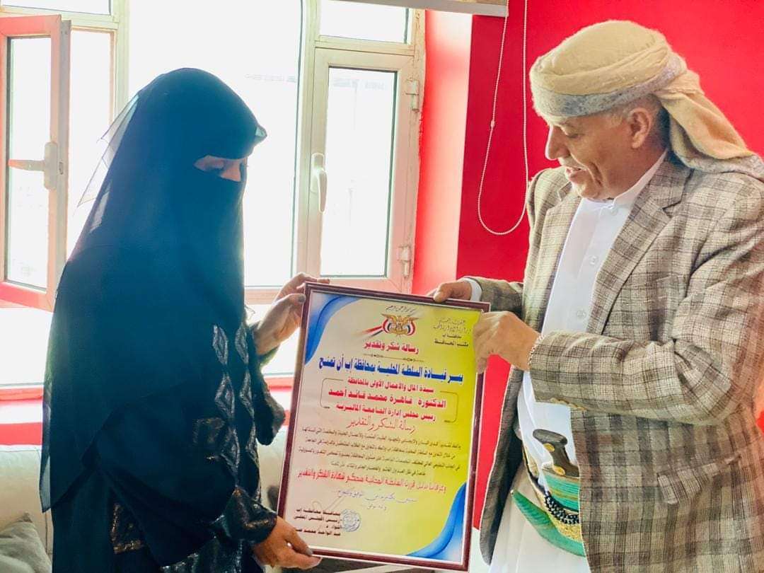 منحت قيادة السلطة المحلية بمحافظة إب لقب سيدة الأعمال الأولى بالمحافظة لللاستاذة قاهرة محمد قايد الهلالي.