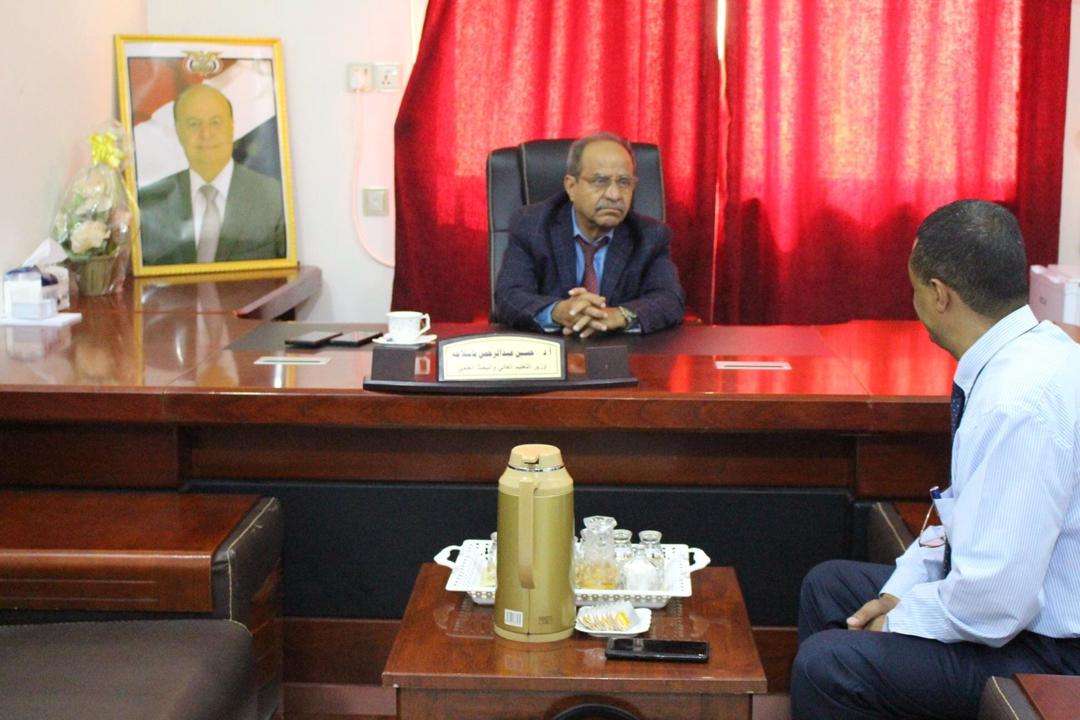 التقى معالي وزير التعليم العالي والبحث العلمي أ.د حسين عبدالرحمن باسلامة اليوم بمكتبة بديوان عام الوزارة بالعاصمة المؤقته عدن رئيس جامعة السعيد الأهلية أ.د ادم الشميري .