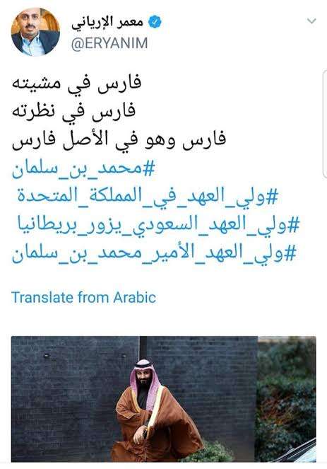 وقال مواطنون لكريتر سكاي:نزل معمر الارياني الى الدرك الاسفل من العمالة والسفالة بمنشوره الغزلي لولي نعمته محمد بن سلمان.