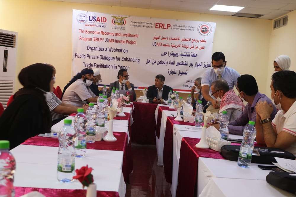 نظم برنامج الانتعاش الاقتصادي وسبل العيش الممول من قبل الوكالة الأمريكية للتنمية USAID، اليوم في عدن، حلقة نقاشية حول تعزيز الحوار بين القطاعين العام والخاص من اجل تسهيل التجارة.