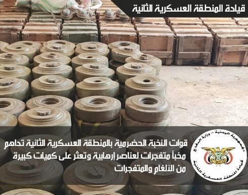 وقال الناطق الرسمي باسم قوات المنطقة العسكرية الثانية هشام الجابري ان أجهزة الإستخباراتية بمشاركة قوات النخبة الحضرمية بالمنطقة العسكرية الثانية استطاعت العثور على مخبأ متفجرات لعناصر إرهابية في أحد البيوت بمديرية الشحر، وُجد داخلها 280 لغم شديدالانفجار وعبوات جُهزت للتفجير وألغام T57 مضاد للدروع .
