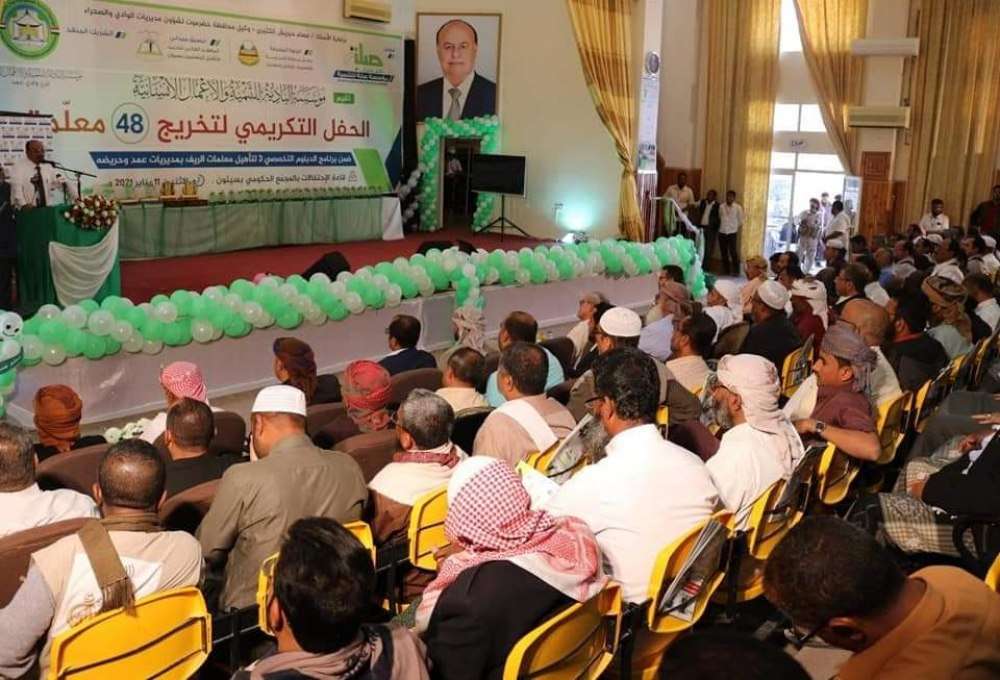 احتفلت مؤسسة البادية للتنمية والأعمال الانسانية ،اليوم، بتخرج 48 معلمة ضمن برنامج الدبلوم التخصصي الثالث لتأهيل معلمات الريف بمديريتي عمد وحريضة الممول من مؤسسة صلة للتنمية وتنفيذ مؤسسة البادية فرع وادي عمد والمعهد العالي لتأهيل وتدريب المعلمين بسيئون واشراف مكتب وزارة التربية والتعليم بوادي حضرموت والصحراء.