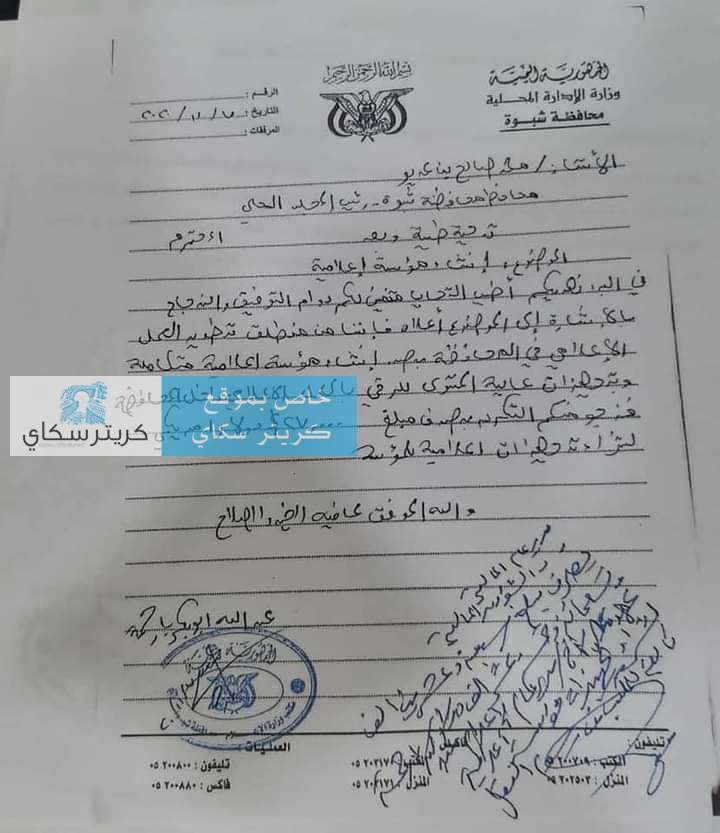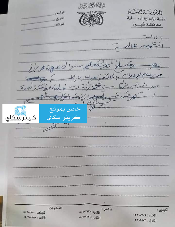 تحصل محرر "كريتر سكاي"، على مذكرات تحمل توجيهات من محافظ شبوة محمد صالح بن عديو، تكشف مدى عنصريته وتعامله مع مدراء عموم مكاتب الوزارات المختلفة انطلاقا من مبدأ ( الأقربون أولى بالدعم)!.