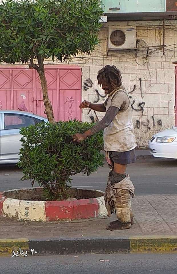 وأشاروا إلى أن المريض ياكل ورق الشجر ومن القمامة ويراه المارة في شارع مدرم بالمعلا شبه يوميا.