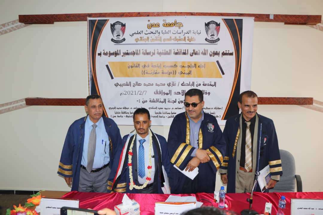 منحت جامعة عدن كلية الحقوق درجة الماجستير بامتياز للباحث الشاب غازي محمد المزارع الشعيبي عن رسالته العلمية الموسومة ب (أداء الواجب كسبب إباحة في القانون اليمني) دراسة مقارنة.