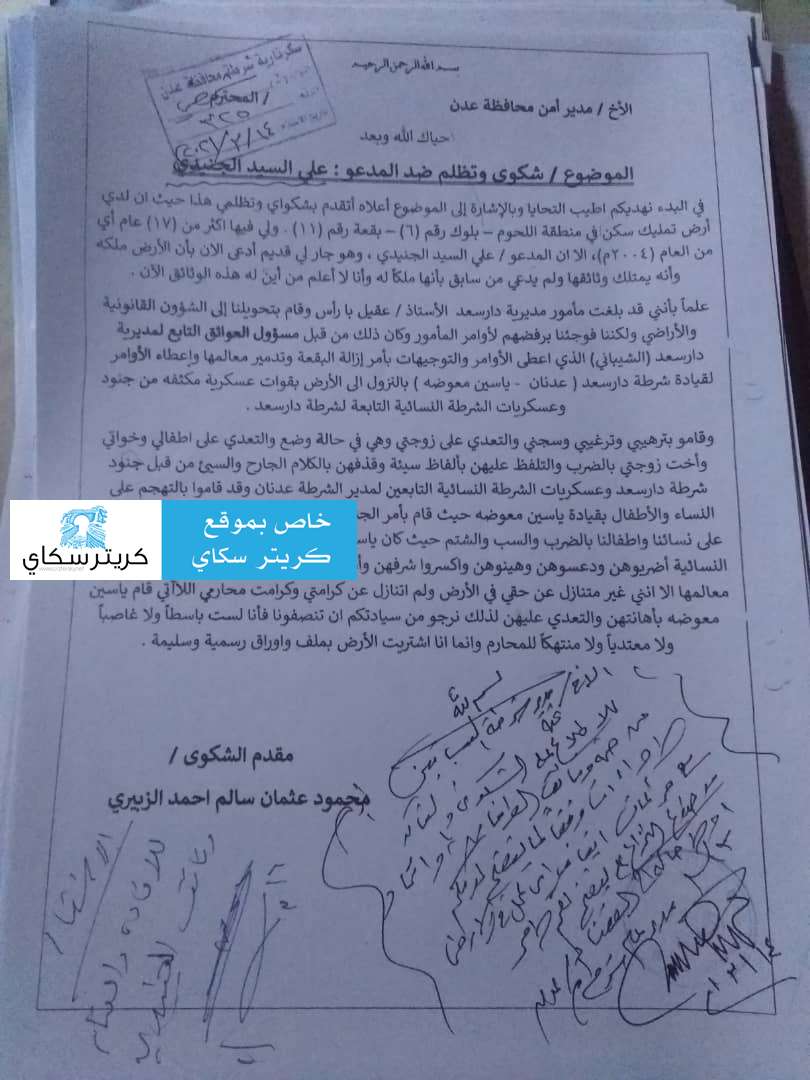 واختتموا:نناشد وزير الداخلية ابراهيم حيدان ومحافظ عدن واحمد لملس التدخل لانصافنا لاننا اصبحنا نعيش بغابة العيش فيها للاقوى والقوي فوق القانون نحن نملك وثائق ارضيتنا بمنطقة اللحوم منذ ١٧ عام والمتنفذ لديه القوة والمال الذي اشتراء به امن عدن.