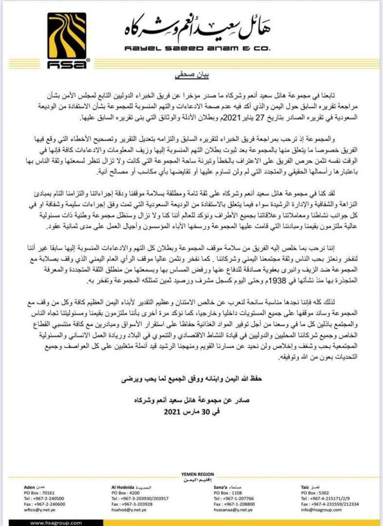رحبت مجموعة شركات هائل سعيد أنعم بمراجعة فريق الخبراء لتقرير السابق والتزامه بتعديل التقرير وتصحيح الأخطاء التي وقع فيها الفريق خصوصا مايتعلق بالمجموعة، مثمنة حرص الفريق على الاعتراف بالخطأ وتبرئة ساحة المجموعة التي كانت ولا تزال تنظر لسمعتها وثقة الناس بها باعتبارها رأسمالها الحقيقي والمتجدد التي لم ولن تساوم عليها أو تقايضها بأي مكاسب أو مصالح آنية.