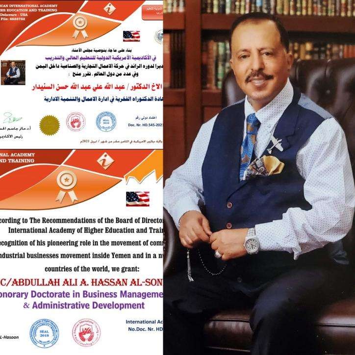 ونظرا لدوره الرائد والقائد بكل تميز وابداع وبكل جد واخلاص ومثابرة وتضحية ولمابذله لتطوير الحركة التجارية والصناعية _ تمنح الاكاديمية الاميركية الدولية للتعليم العالمي رجل الاعمال البارز البرنس عبدالله علي السنيدار _ درجة الدكتوراه الفخرية في ادارة الاعمال والتنمية الادارية .