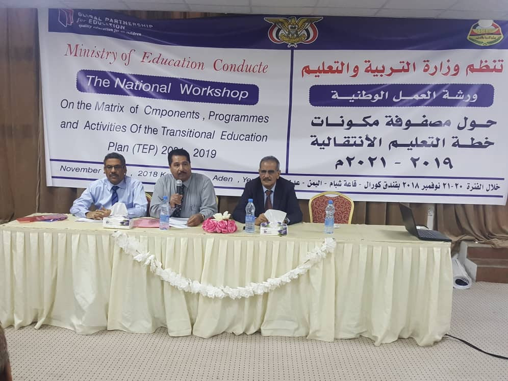 بحضور معالي وزير التربية والتعليم الدكتور عبدالله سالم لملس، نظمت وزارة التربية ورشة العمل الوطنية حول مصفوفة محاور برامج وانشطة الخطة الانتقالية للعام 2019 - 2021م لمدة يومين الثلاثاء والاربعاء الموافق 20- 21 / 11 / 2018 بفندق كورال في العاصمة المؤقتة عدن.