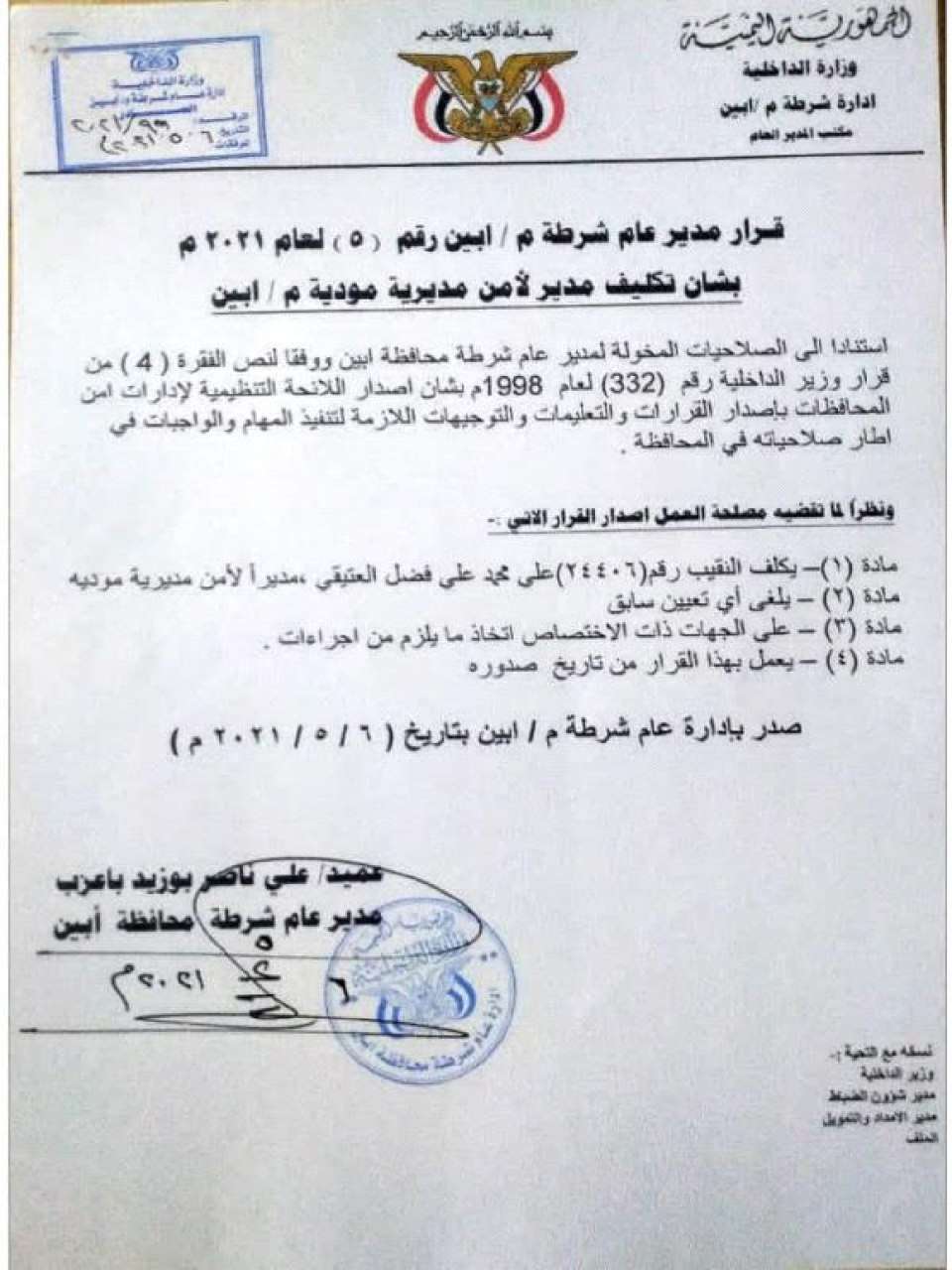 مادة (1) يكلف النقيب علي محمد علي العتيقي مديراً لأمن مودية