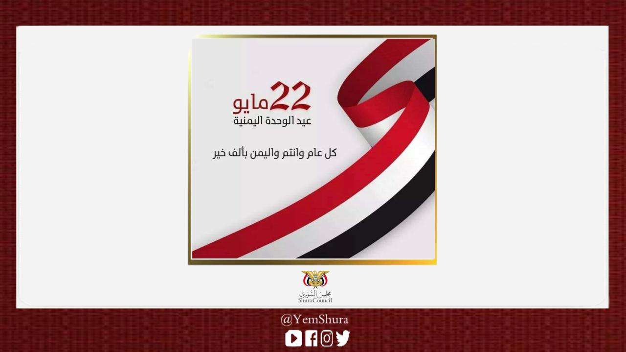 تهل علينا ذكرى الثاني والعشرين من مايو العظيم، الذي التأم فيه شمل الإخوة، وتحققت وحدة اليمن، أعظم منجزات شعبنا في العصر الراهن، وأحد أبرز المنعطفات الكبيرة في تاريخ الأمة العربية، إسمحوا لي بهذه المناسبة العظيمة أن أرفع إليكم باسمي وزملائي في مجلس الشورى التهاني بهذه المناسبة العظيمة.