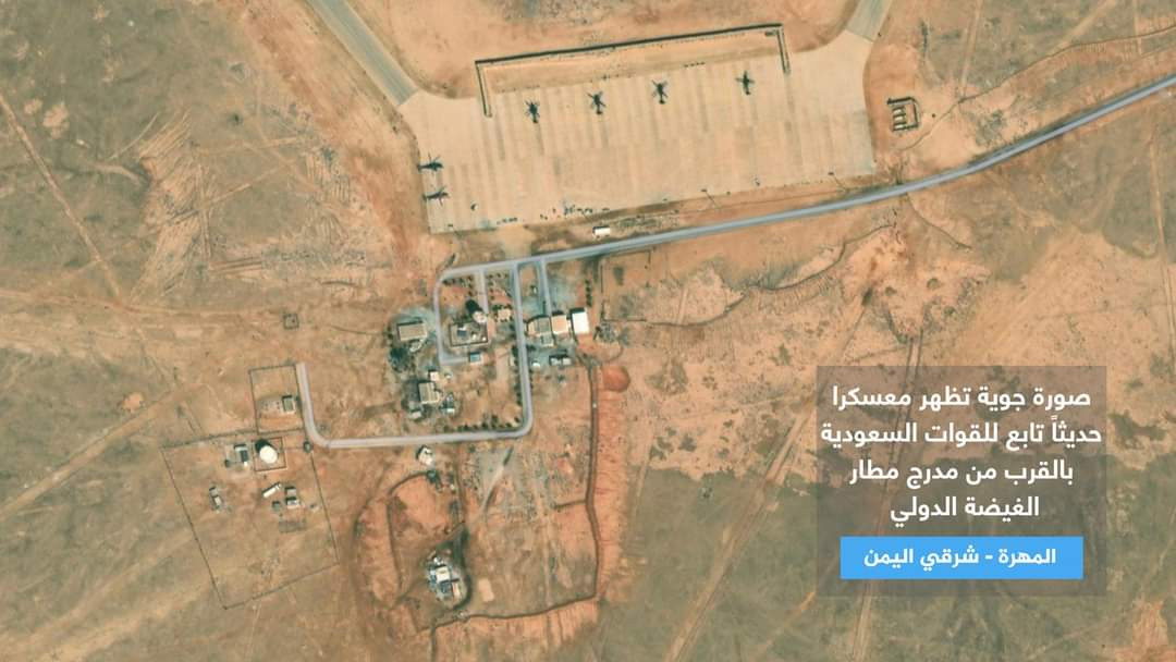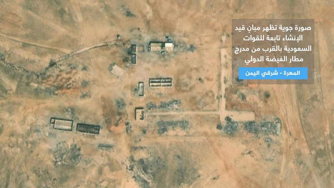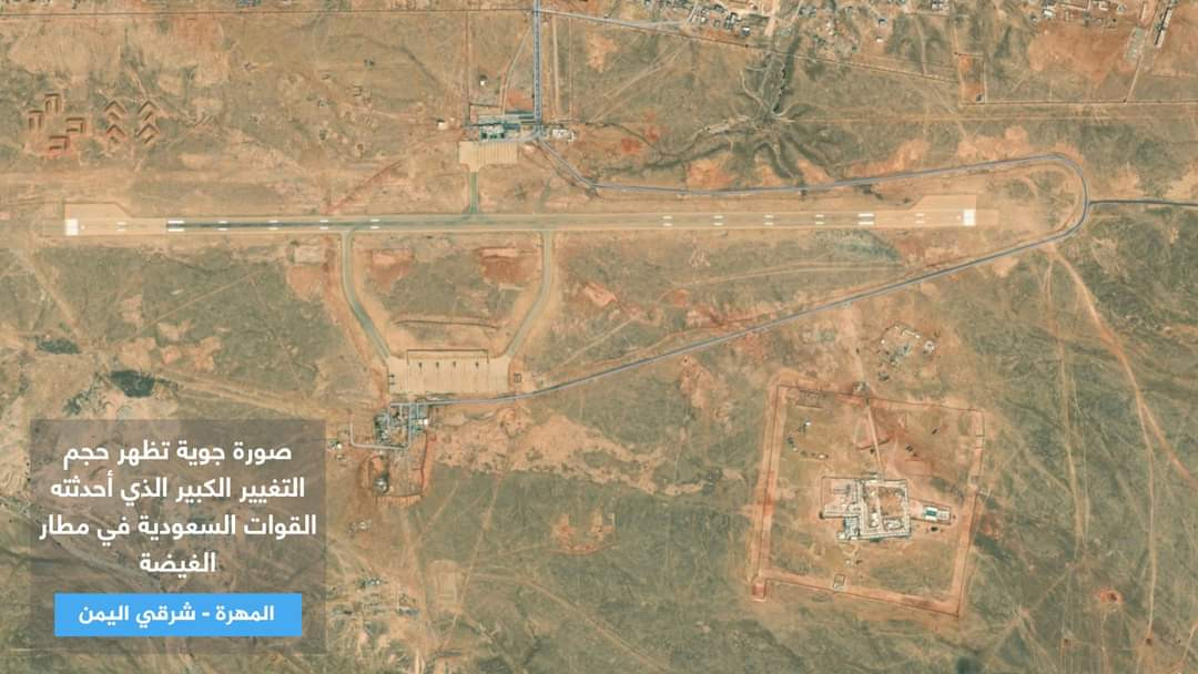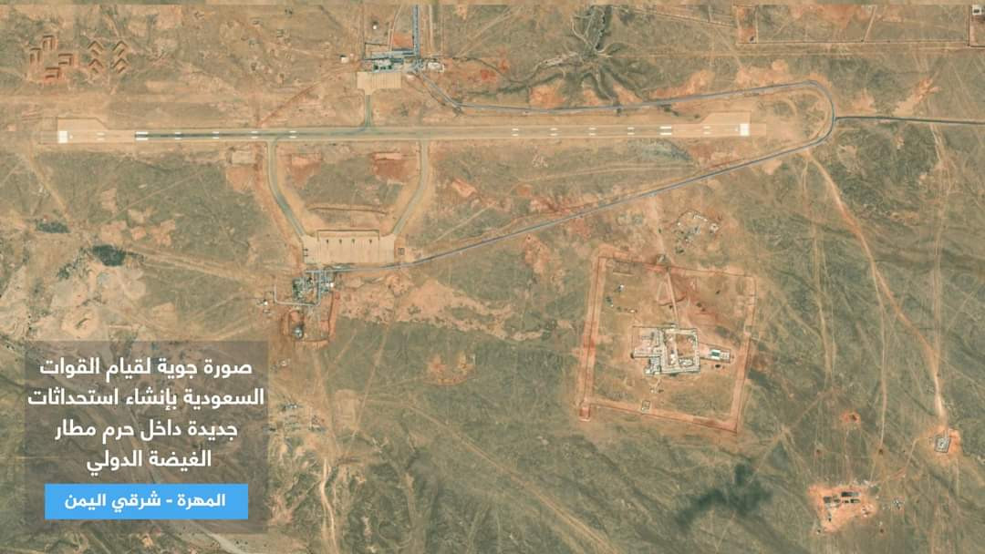 وتظهر الصور التي تعرض للمرة الأولى قيام القوات السعودية ببناء إنشاءات عسكرية كبيرة وتحويل مطار الغيضة بمحافظة المهرة الحدودية مع سلطنة عمان إلى قاعدة عسكرية واستمرار إغلاقه أمام الرحلات المدنية للمواطنين واقتصاره على الرحلات العسكرية للقوات السعودية.