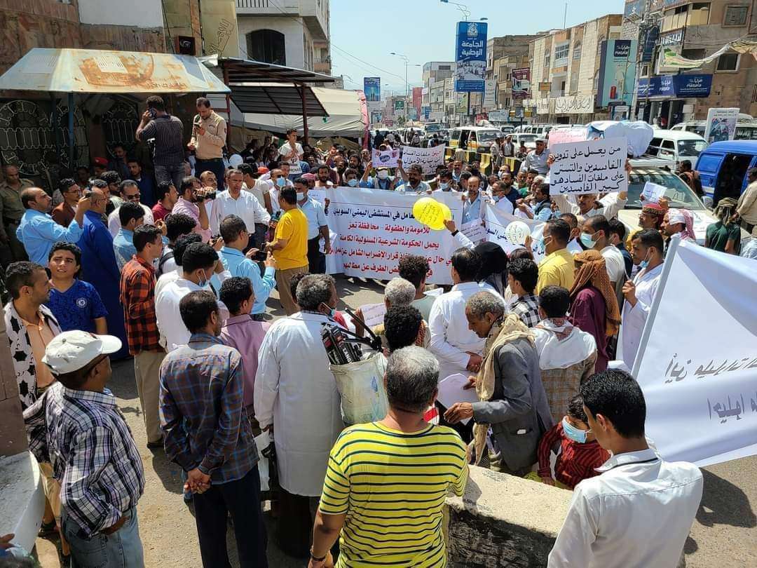 نفذ مجموعة من الكادر الطبي في سنة تعز وقفة احتجاجية أمام مبنى المحافظة .