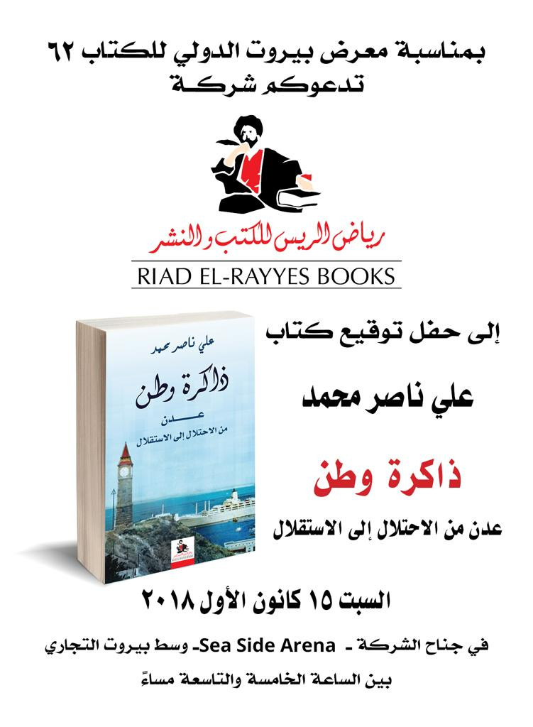 ووجهت شركة رياض الريس للكتب والنشر بمناسبة معرض بيروت الدولي 62 دعوى للمثقفين والادباء والنشطاء والسياسيين لحضور حفل توقيع كتاب الرئيس علي ناصر محمد في جناح الشركة -se side arena وسط بيروت التجاري من الساعة الخامسة مساء وحتى الساعة التاسعة.