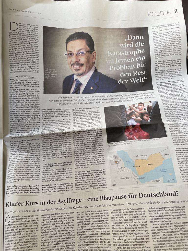 وفي الحوار الصحافي الذي اجراه وزير الخارجية مع صحيفة WELT الالمانية واسعة الانتشار ، على هامش زيارته الى برلين ، اذ أكد بن مبارك