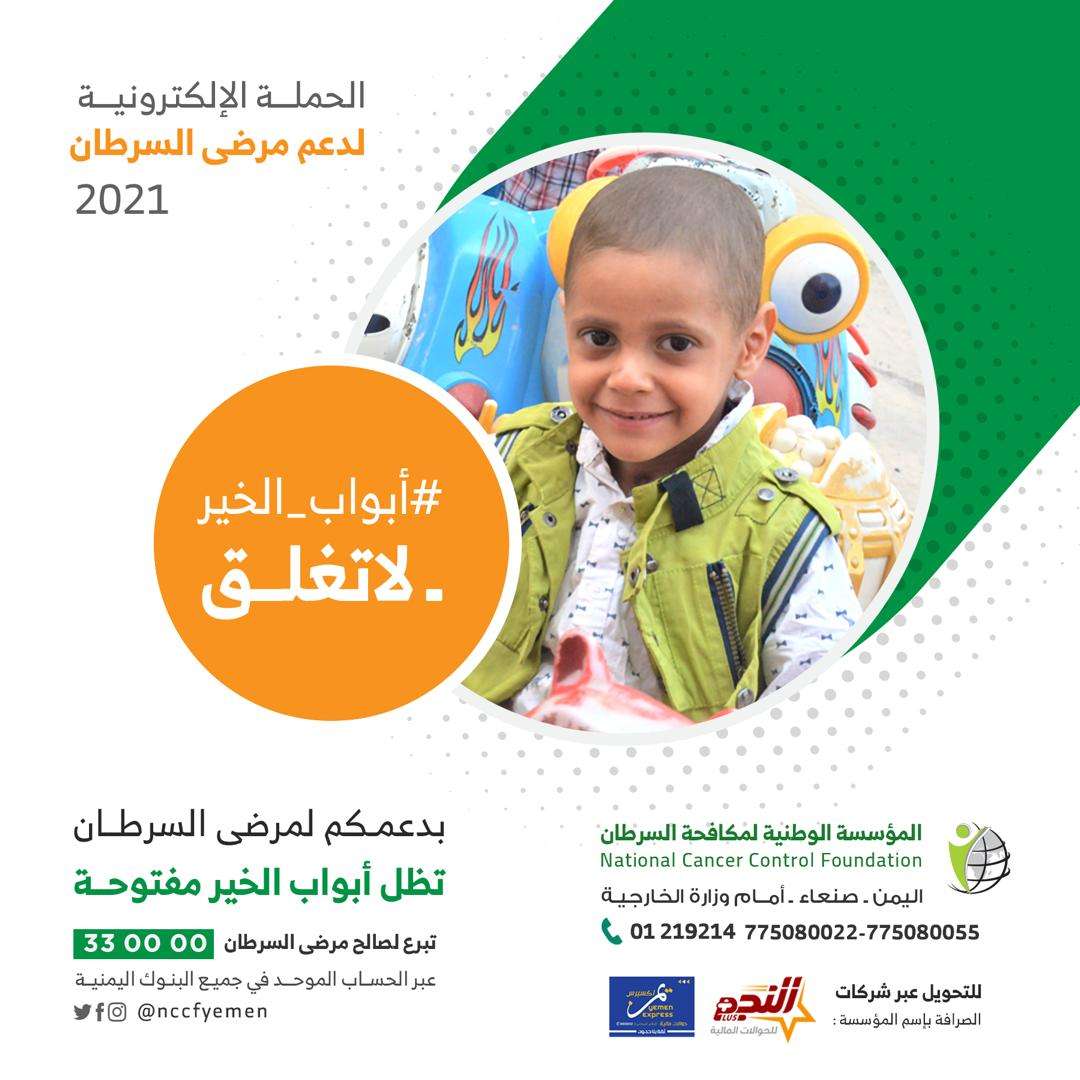 تطلق المؤسسة الوطنية لمكافحة السرطان اليوم السبت الموافق3/7/2021م الحملة الإلكترونية والتي تحمل عنوان (#أبواب_الخير _ لاتغلق )والتي ستكون مختلفة عن سابقاتها حيث ستشمل عدة مسارات لعل أهمها هو التسويق للخدمات الطبية والإجتماعية التي تقدمها المؤسسة والبحث عن جهات أو شخصيات تساهم في تحمل تلك الخدمات التي تثقل كاهل المؤسسة والتي لاغنى لأي مريض عنها ,فمرضى السرطان يعتمدون بعد الله على مايقدم لهم, وتوقف أي خدمة هو كارثة حقيقية لأناس عصف السرطان بحياتهم وأحال بسماتهم إلى أحزان