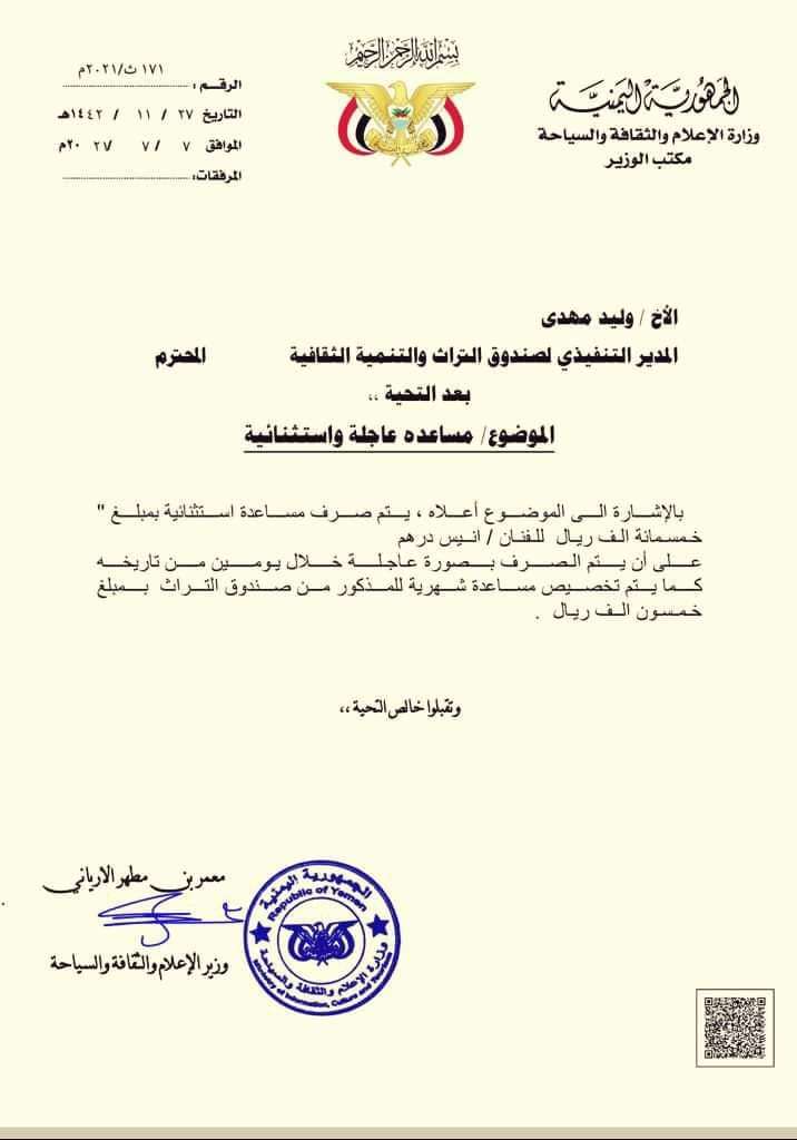 وجه وزير الإعلام والسياحة والثقافة معمر الارياني بصرف مساعدة عاجلة واستثنائية للفنان أنيس درهم .