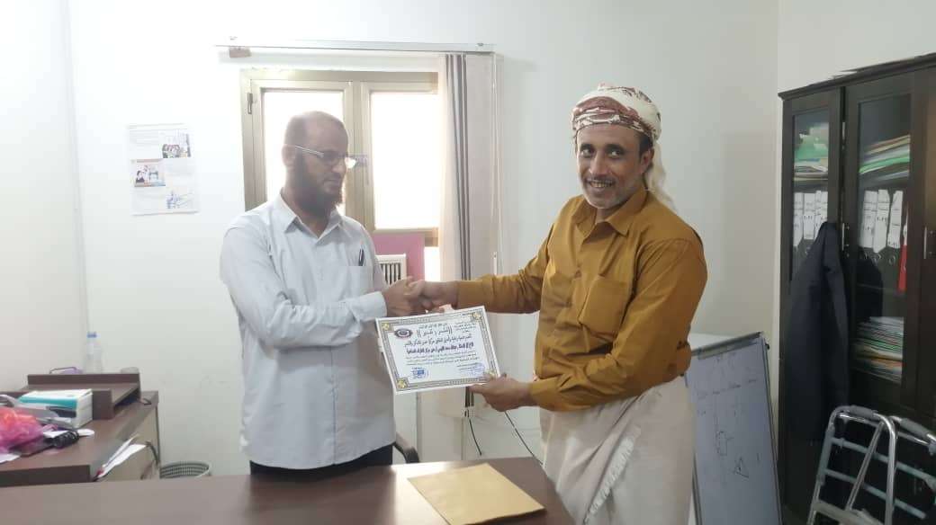 وعبر الاستاذ نصر السقاف مدير جمعية رعاية وتأهيل المعاقين حركيأ عن شكرة وتقديره في كلمه وجهها اثنا تقديمه شهادة التقدير والذي اكد علئ ماقدمة القيسي ومركز الاطراف الاصطناعية والعلاج الطبيعي من جهود جباره ورعايه لن يستطع رده لم