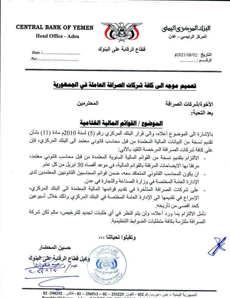 أصدر البنك المركزي اليمني – المركز الرئيسي عدن، صباح اليوم تعميم هام موجه الى كافة شركات الصرافة العاملة في الجمهورية، حول القوائم المالية الختامية إستناداً الى قرار البنك المركزي رقم (5) لسنة 2010م حسب المادة (11) بشأن تقديم نسخة من البيانات المالية المعتمدة الى البنك المركزي، من قبل محاسب قانوني معتمد.