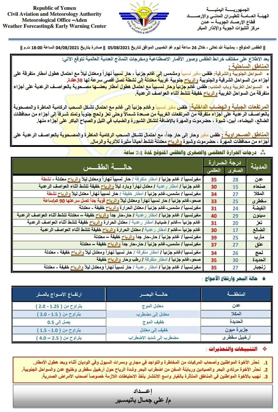 وقالت المراصد أن مدينة عدن ستشهد يوم غدا الخميس أمطار متفرقة من المدينة .