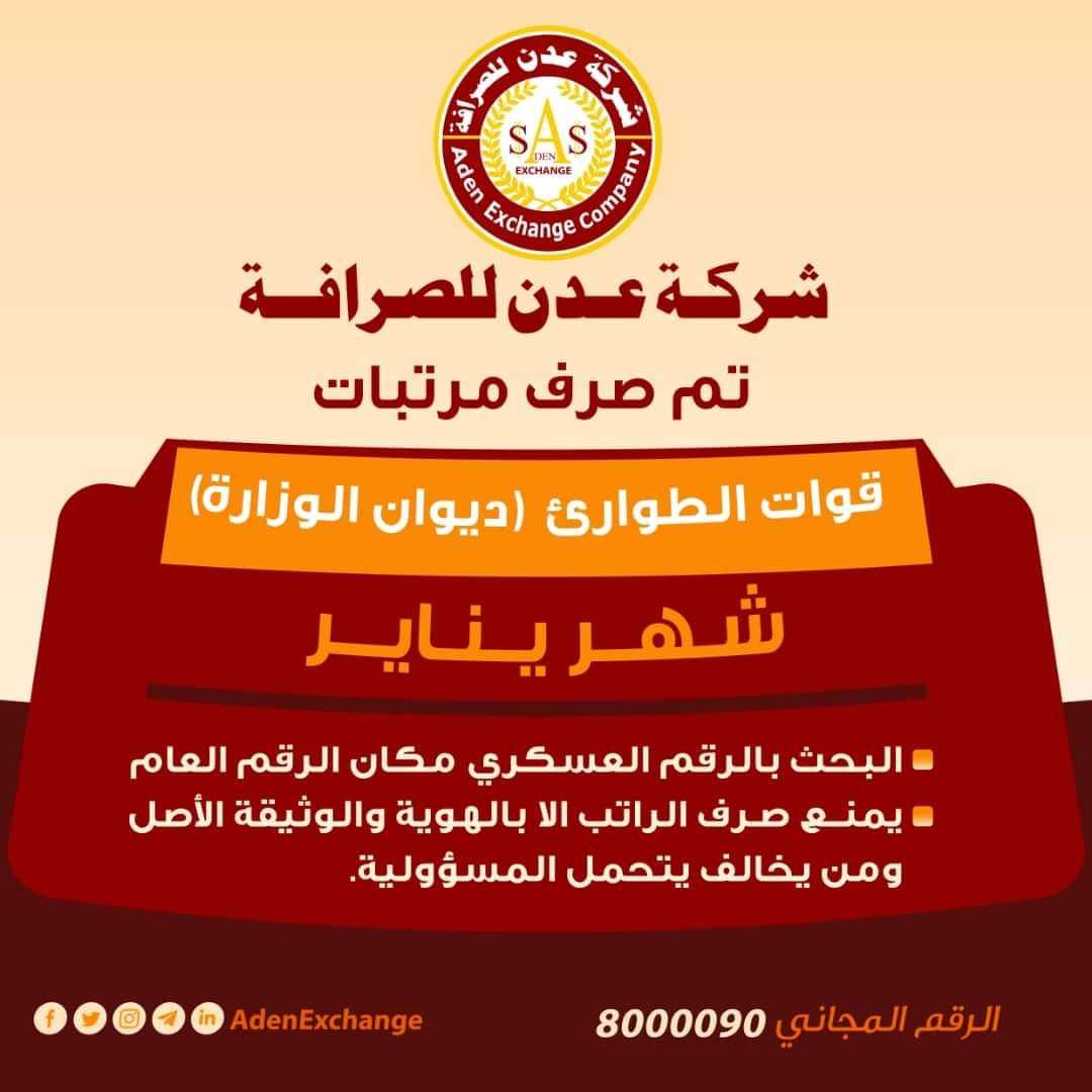 أعلنت شركة عدن للصرافة عن صرفها رواتب شهر يناير لكل من قوات الطوارئ (ديوان وزارة الداخلية).